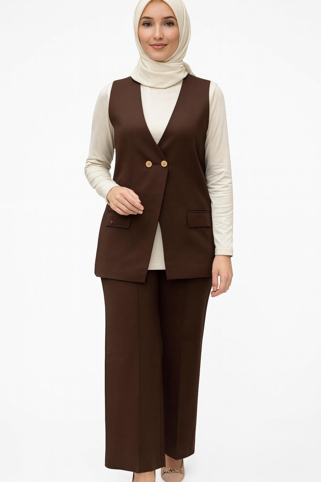 Armine TREND Çift Düğme Detaylı Yelekli Triko Takım Kahverengi 25YTD6117
