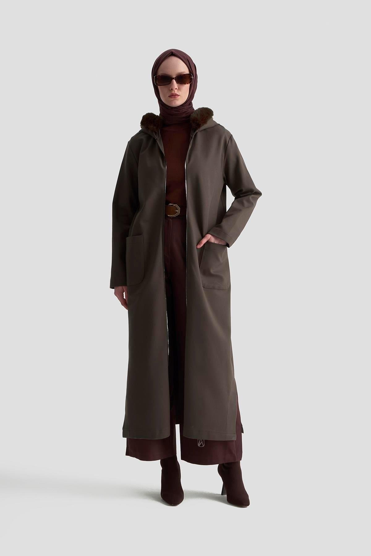 Armine TREND Kapüşon Kürk Detay Örme Kumaş Kap Vizon 25KT528 - 25KT541