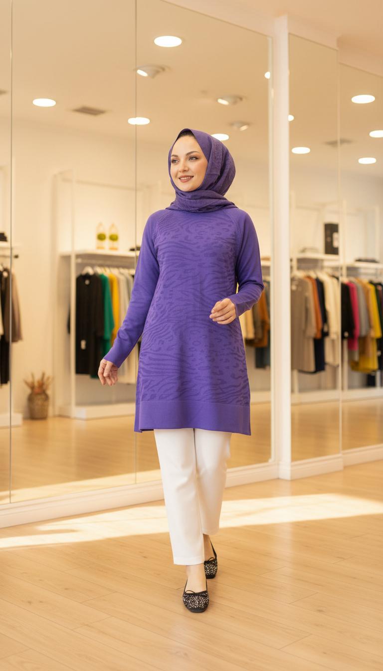 Konfor ve şıklığı buluşturan bu triko tunik, zarif dokuma deseniyle modern bir görünüm sunar.