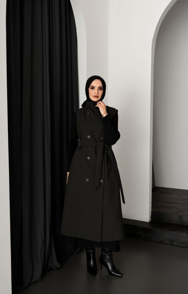 içi astarlı düğme detaylı kemerli arkası yırtmaçlı,