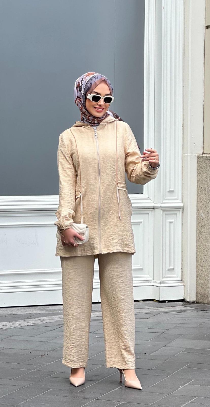 Nihle Ceket Fermuarlı Kapüşonlu  Pantolonlu Spor Bayan Takım Bej