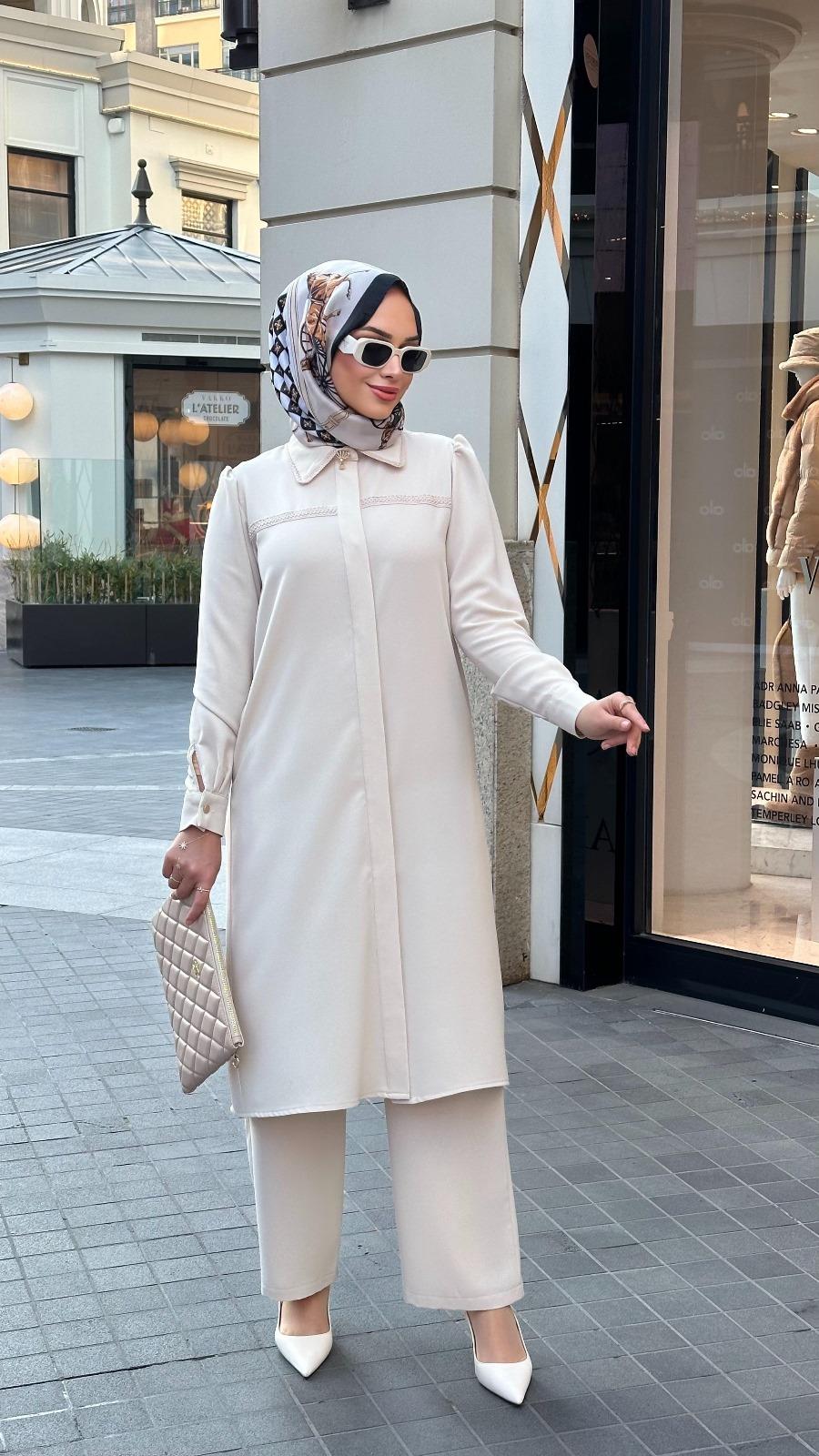 Nihle Yaka Nakış Detaylı Pantolonlu Bayan Takım Bej