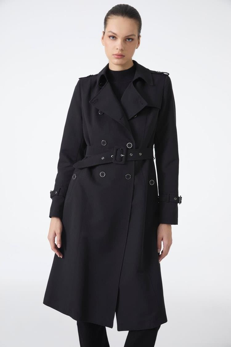 Zühre Kruvaze Yaka Beli Kuşaklı Uzun Siyah Trençkot 12528