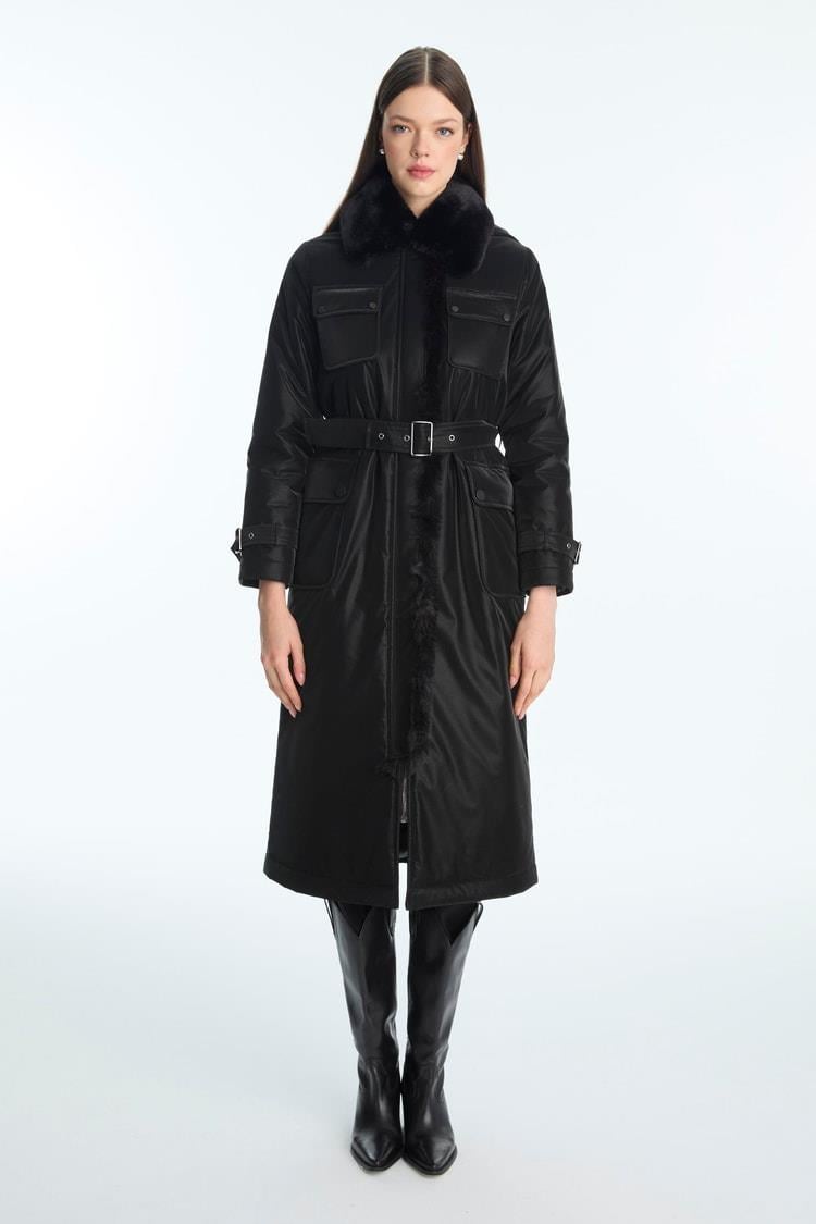 Zühre Kürk Yaka Cep Detaylı Kemerli Siyah Mont 13868